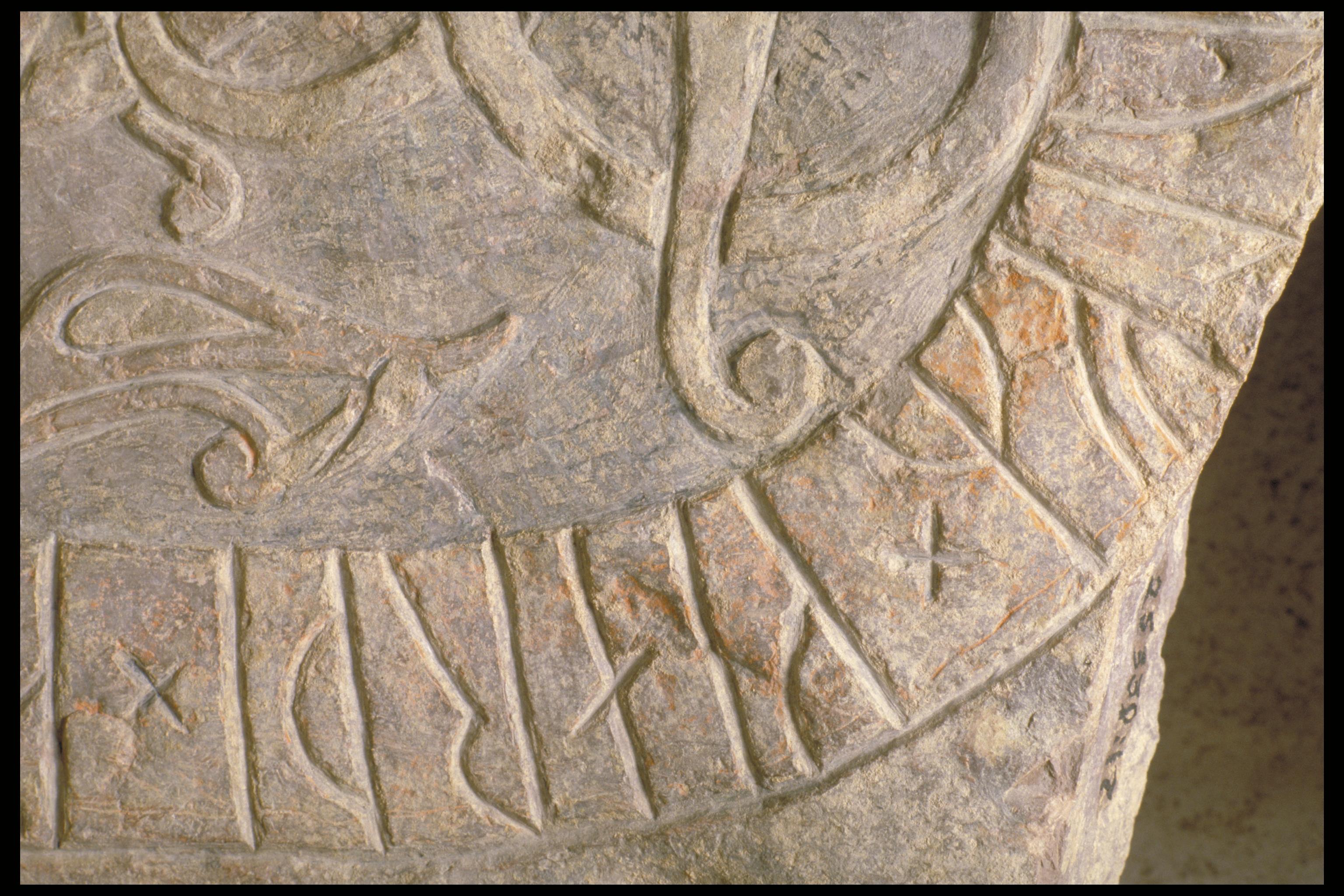 Reliefhuggen, svart färg på ytan och i runor.
