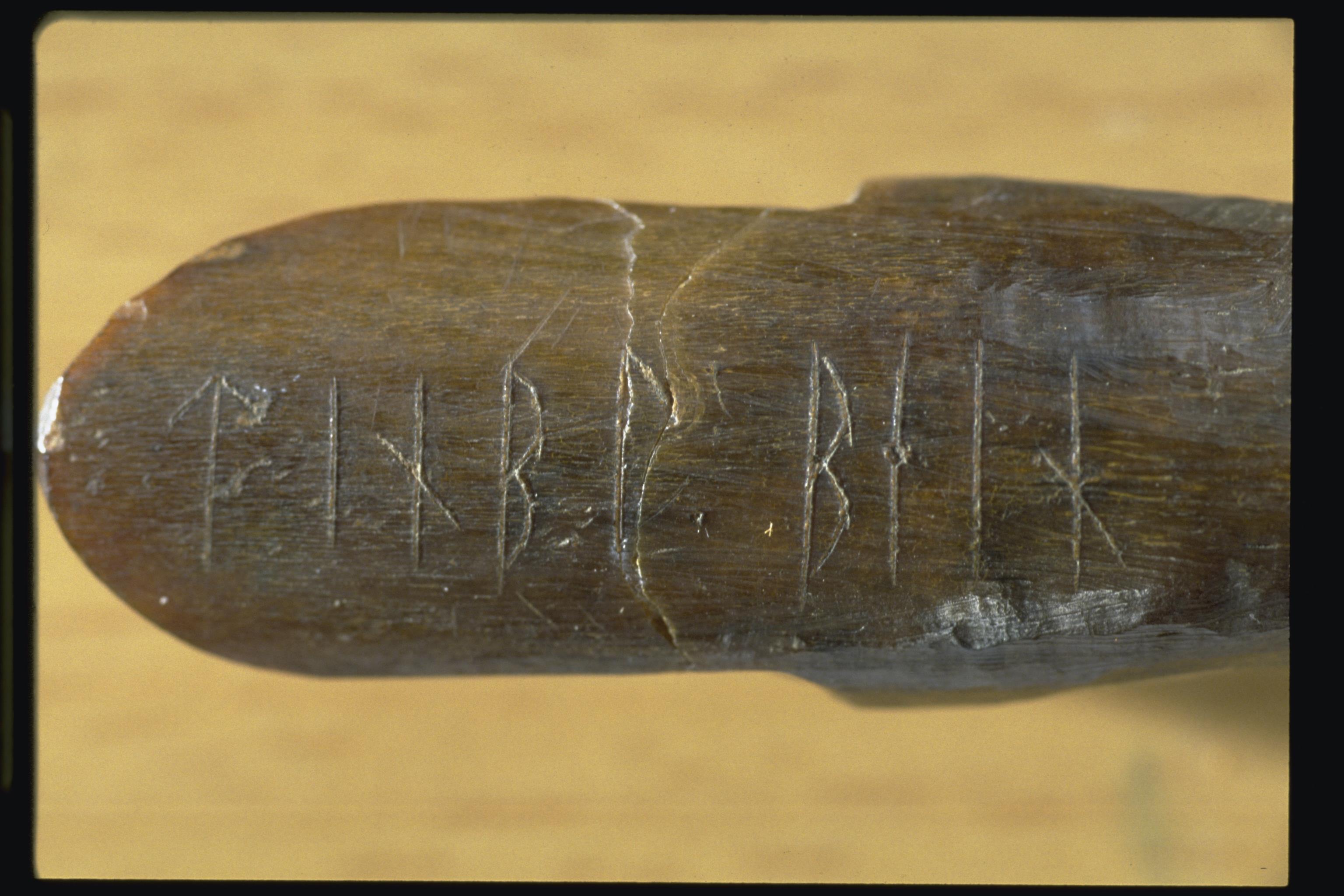 Runinskriften på en bennål i Lunds historiska museum