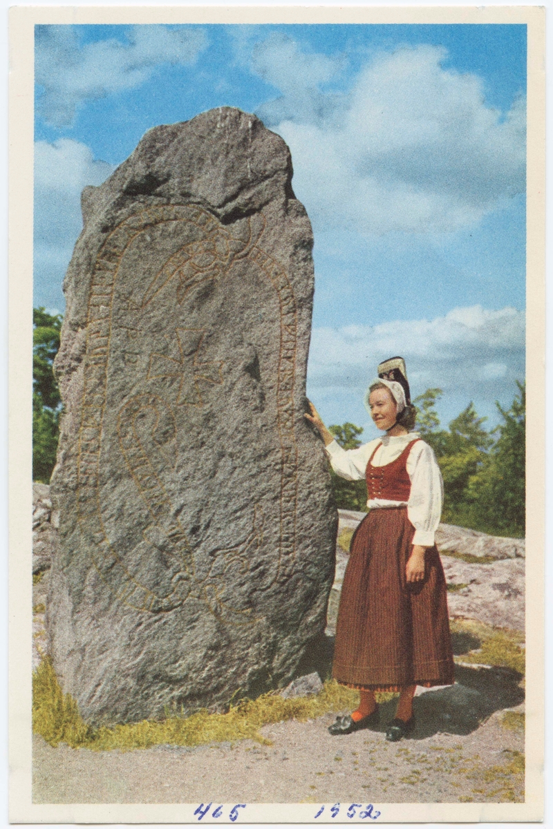 Vykort med motiv från Skansen. "Dräkt från Häverö, Uppland." Kvinna i folkdräkt invind runsten, "Norslundastenen". – Sundqvist, Bengt; Hadorph, Johan, Aschaneus, Martin, Leitz, Johan, Okänd, Hallgren, Sören"@sv; 1945-01-01 URI