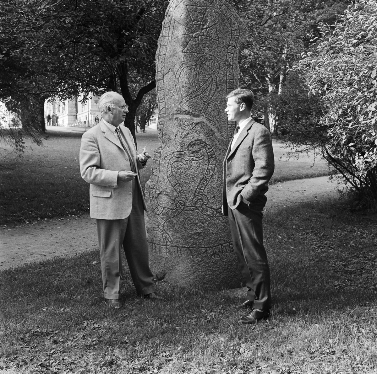 Uppsalarkeologer tillbaka från grävsommar på Irland, Mårten Stenberger vid runsten, Uppsala 1961 – Uppsala-Bild; Anderson, Iwar"@sv; 1961-09-23 URI