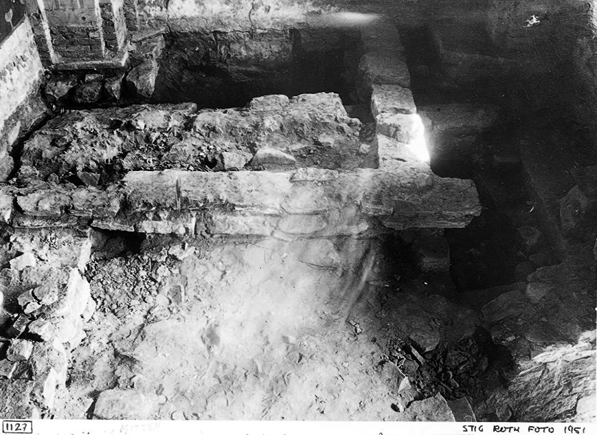 Koret mot öster. I mitten (förgrunden) sockelmuren till 1811 års altare. Därbakom det medeltida korets östmur. Vid solfläcken runstenen. – Hadorph, Johan, Törnevall, Petrus, Okänd, Brenner, Elias"@sv; Hadorph, Johan, Törnevall, Petrus, Okänd, Brenner, Elias"@sv; 1951-01-01 URI